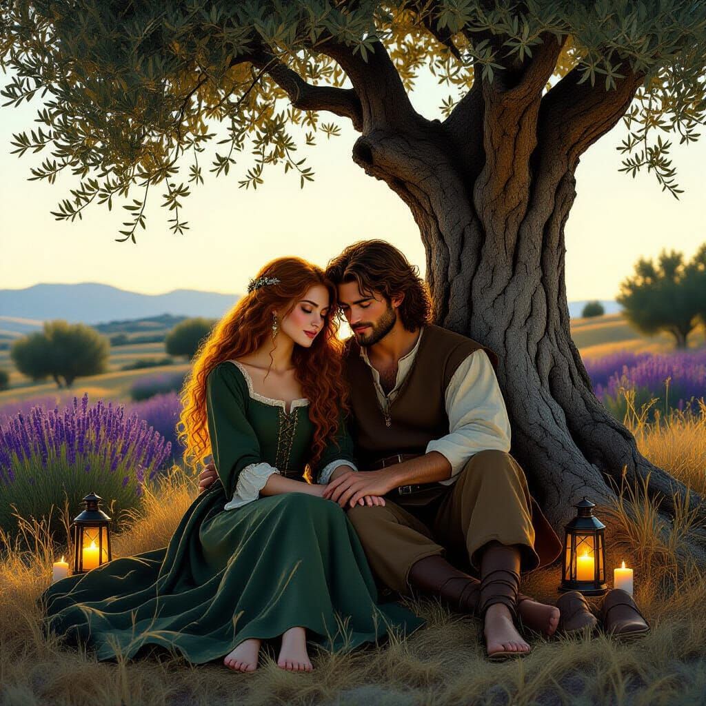 A serene image of a medieval woman and her brother resting under an olive tree at sunset. Soft light illuminates the scene, creating a calm and intimate atmosphere in a realistic style.