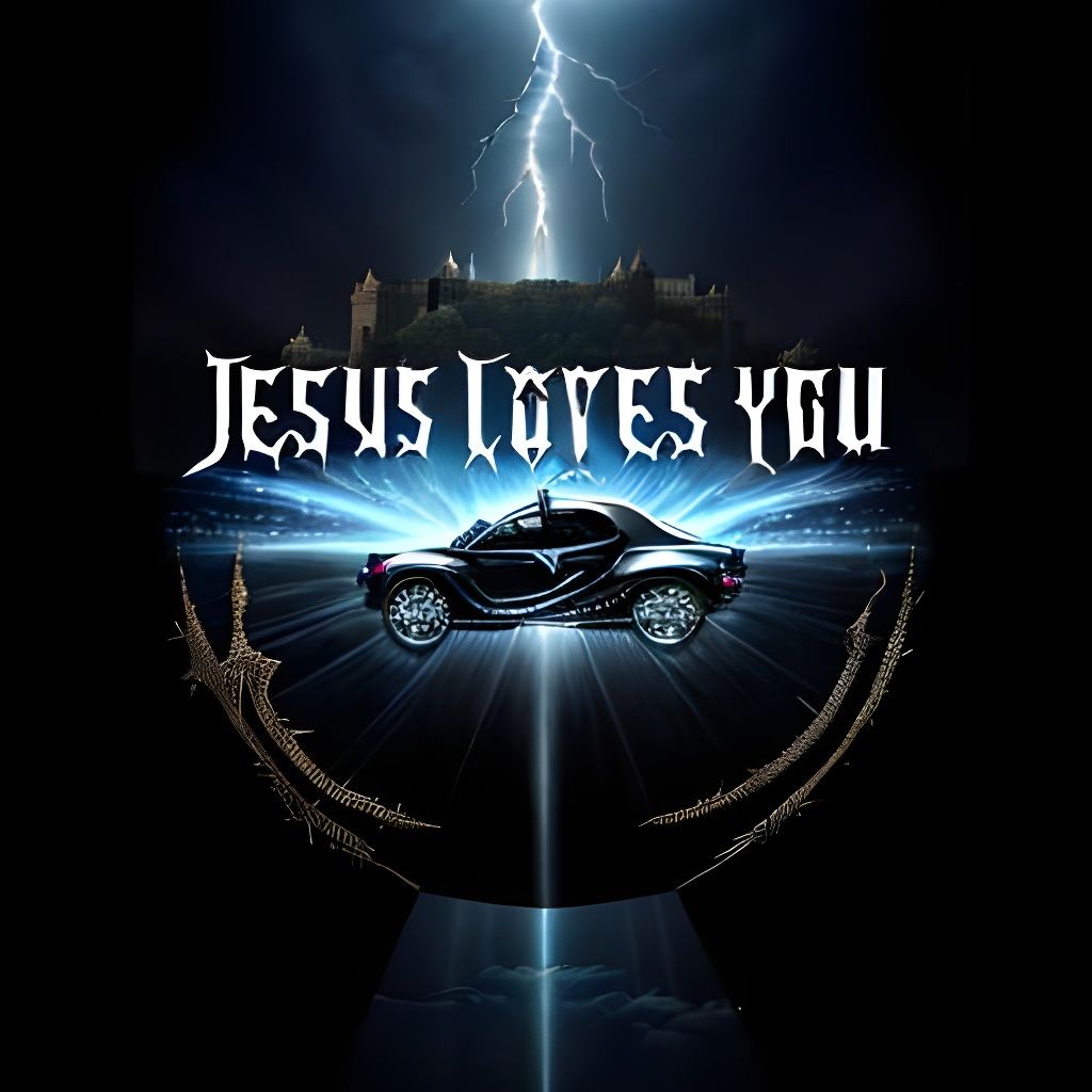 This image depicts the words 'Jesus loves you' surrounded by Gothic architecture and heavy metal imagery. Lightning and fleur de lis add to the ornate and somewhat ostentatious aesthetic.