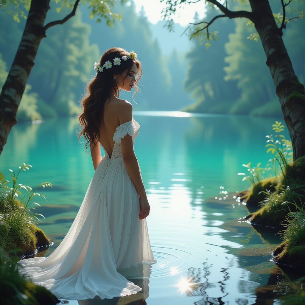 This image shows a serene woman with flowers in her hair, standing by a mystical lake. The scene is bathed in soft light, with a cinematic and hyperrealistic aesthetic reminiscent of fantasy art.