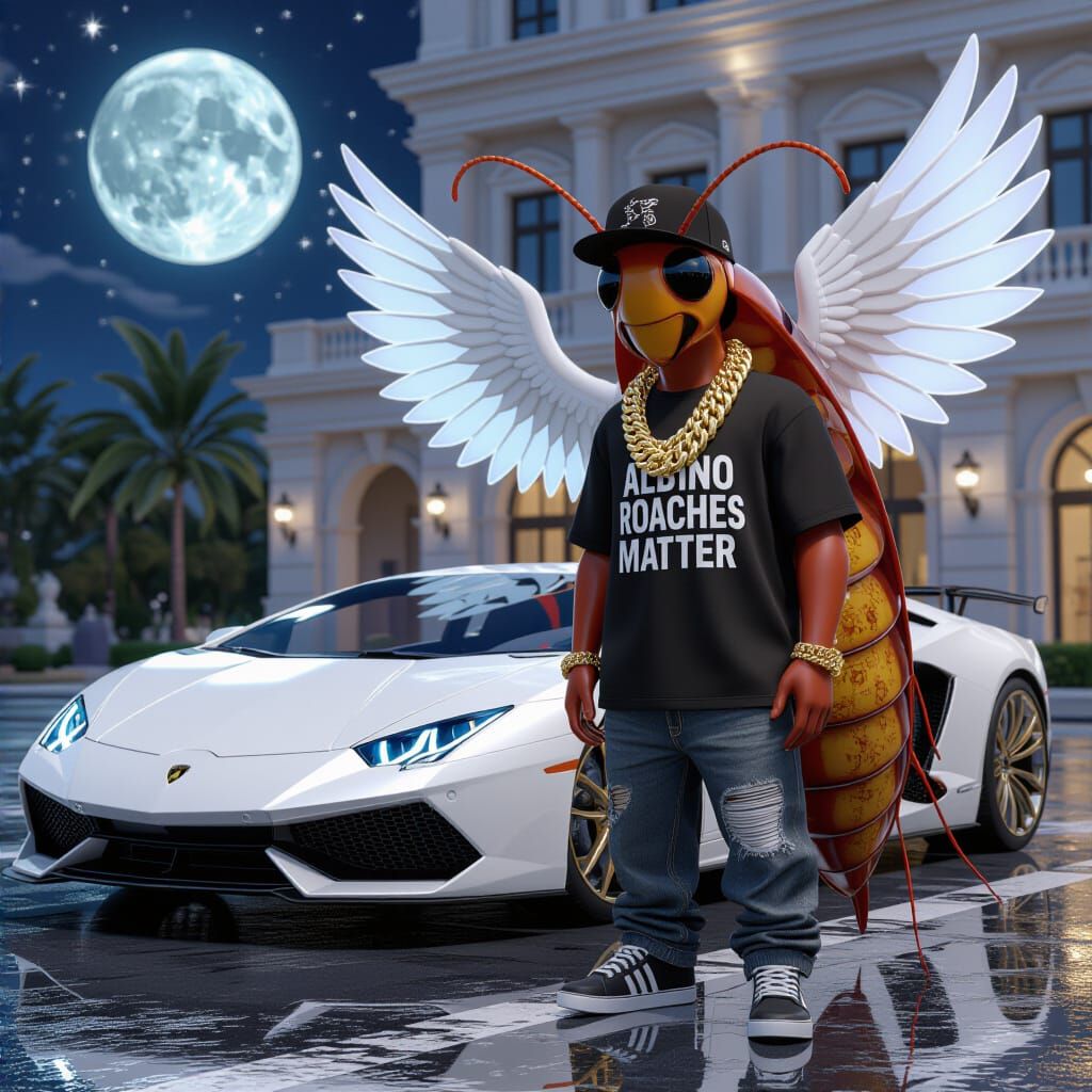 A realistic humanoid roach rapper sports gold chains and a trucker hat, standing beside a white Lamborghini Urus with moon rims. Artistically rendered in a detailed 3D anime style.