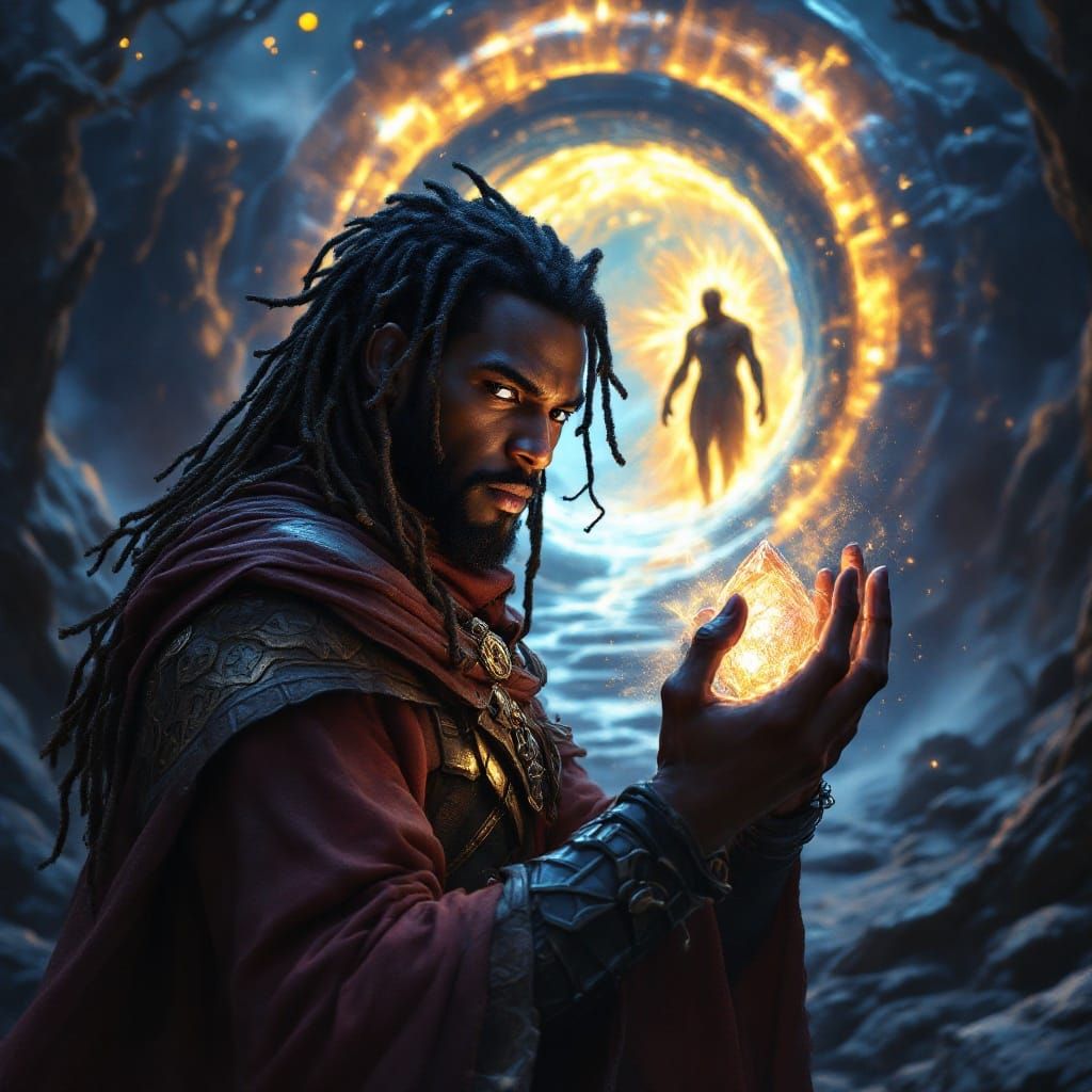 A close-up of a mystical moment: an African American adventurer focuses on a glowing crystal, surrounded by darkness, as a magical portal opens in the background, revealing a humanoid creature stepping through in a vibrant, hyperrealistic scene.