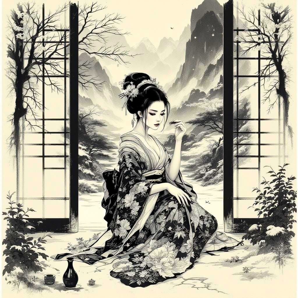 This image shows a beautiful geisha in a winter garden, preparing tea. The artwork features high contrast and a muted color palette, reminiscent of traditional Japanese sumi-e ink painting.