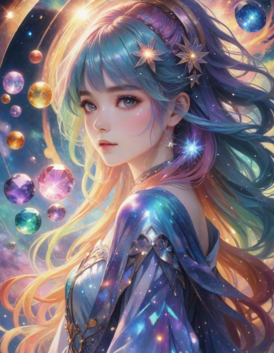 This image shows a young woman with rainbow hair wearing a stardust dress. The digital art features shimmering gemstones, nebulae, and soft, ethereal lighting in pastel colors, creating a dreamy cosmic aesthetic.