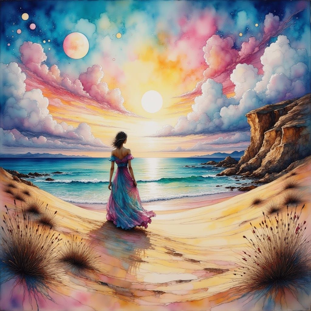 This image shows a mystical desert landscape where the ocean's edge meets the sandy dunes, as depicted in a dreamlike, ink-inspired art style.