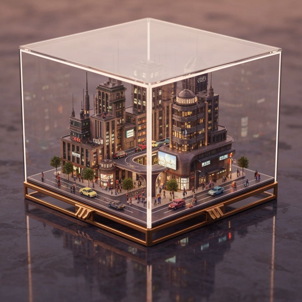 This image shows a hyperrealistic micro-city contained within a glass jewelry box. The futuristic cityscape is filled with tiny details, soft lighting, volumetric fog, and reflections, creating an immersive, detailed scene.