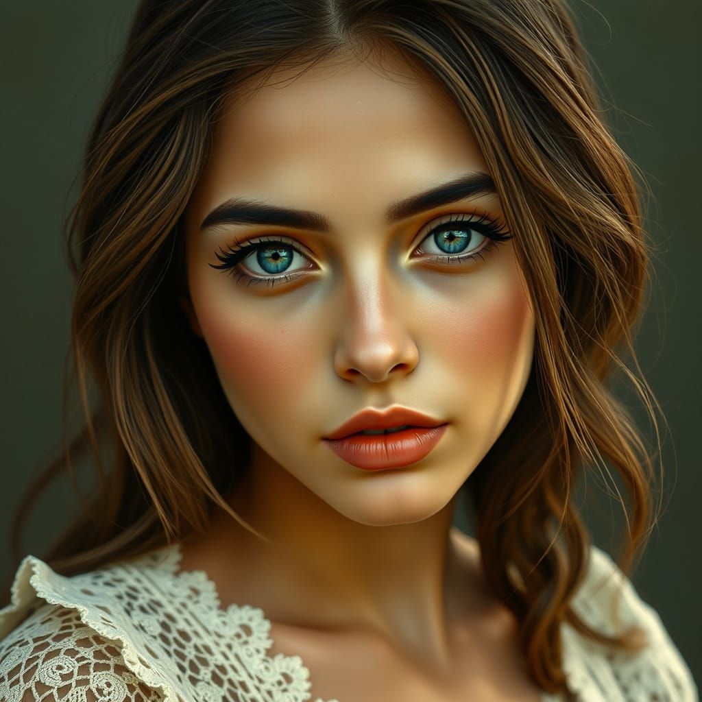 This image shows a beautiful young Libyan woman with light skin, captivating turquoise eyes, and flowing brown hair, adorned in a cream-white lace outfit, rendered with realistic detail in an art nouveau style.