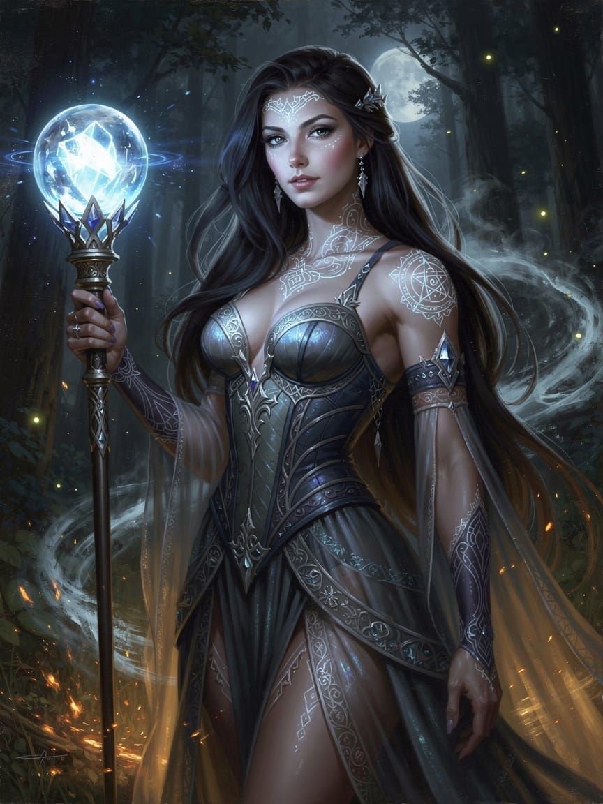 A mystical enchantress with glowing eyes stands in a moonlit forest, holding a staff. The portrait features intricate tattoos, ethereal mist, and dramatic lighting in a painterly oil on canvas style.