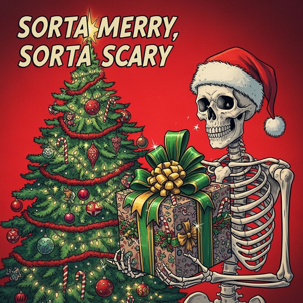 This image shows a skeleton in a Santa hat holding a gift beside a decorated Christmas tree. The artwork features fine linework and dynamic lighting in a graphic novel style, with vibrant colors and eerie highlights.