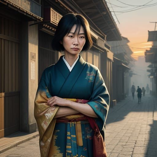 This image shows a woman standing on an empty street clutching a haori. The cinematic shot captures soft focus, long shadows and golden light in a vibrant oil painting style.