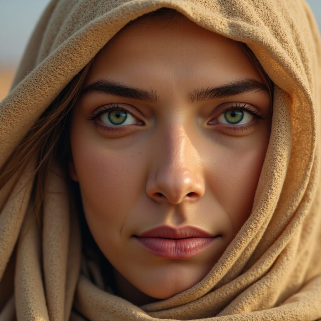 This image shows a veiled Middle Eastern woman in a desert landscape. The artwork features warm colors, sharp focus, and sparkling green eyes, reminiscent of Gustav Klimt's style.