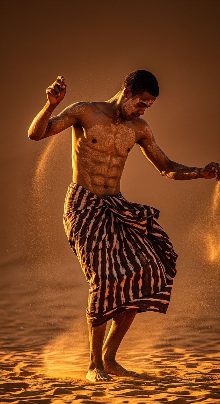 This image shows a muscular young man dancing dynamically in a loincloth. Cinematic lighting highlights his physique with intricate textures and vibrant colors, creating a dramatic, focused scene.