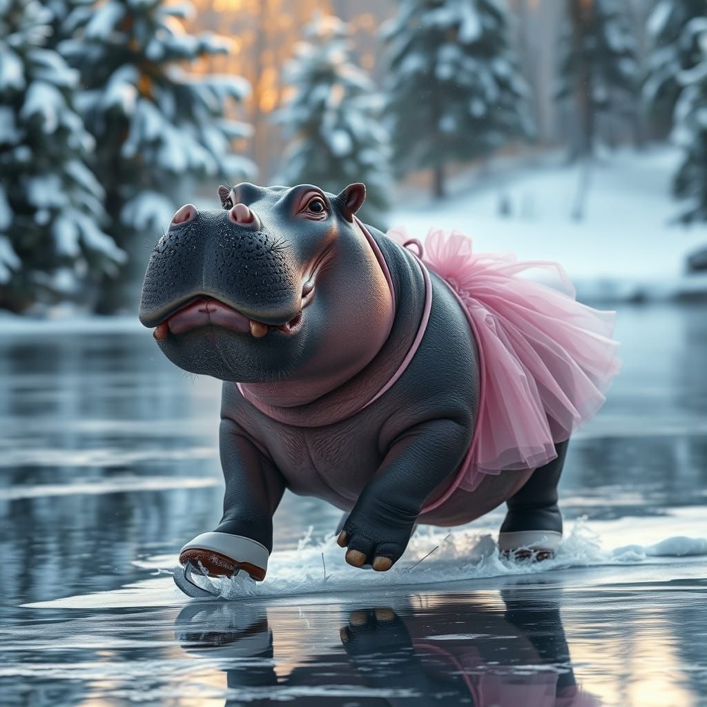 This serene image captures a female hippopotamus effortlessly gliding across a frozen pond, surrounded by snow-covered pine trees, in a photorealistic style reminiscent of wildlife photography