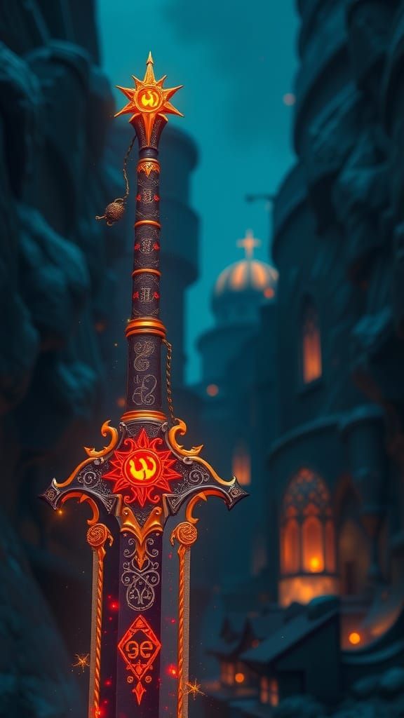 A fantasy sword with glowing runes is displayed against a high-contrast backdrop. The digital painting features deep blues and oranges and is reminiscent of a dystopian sci-fi aesthetic.