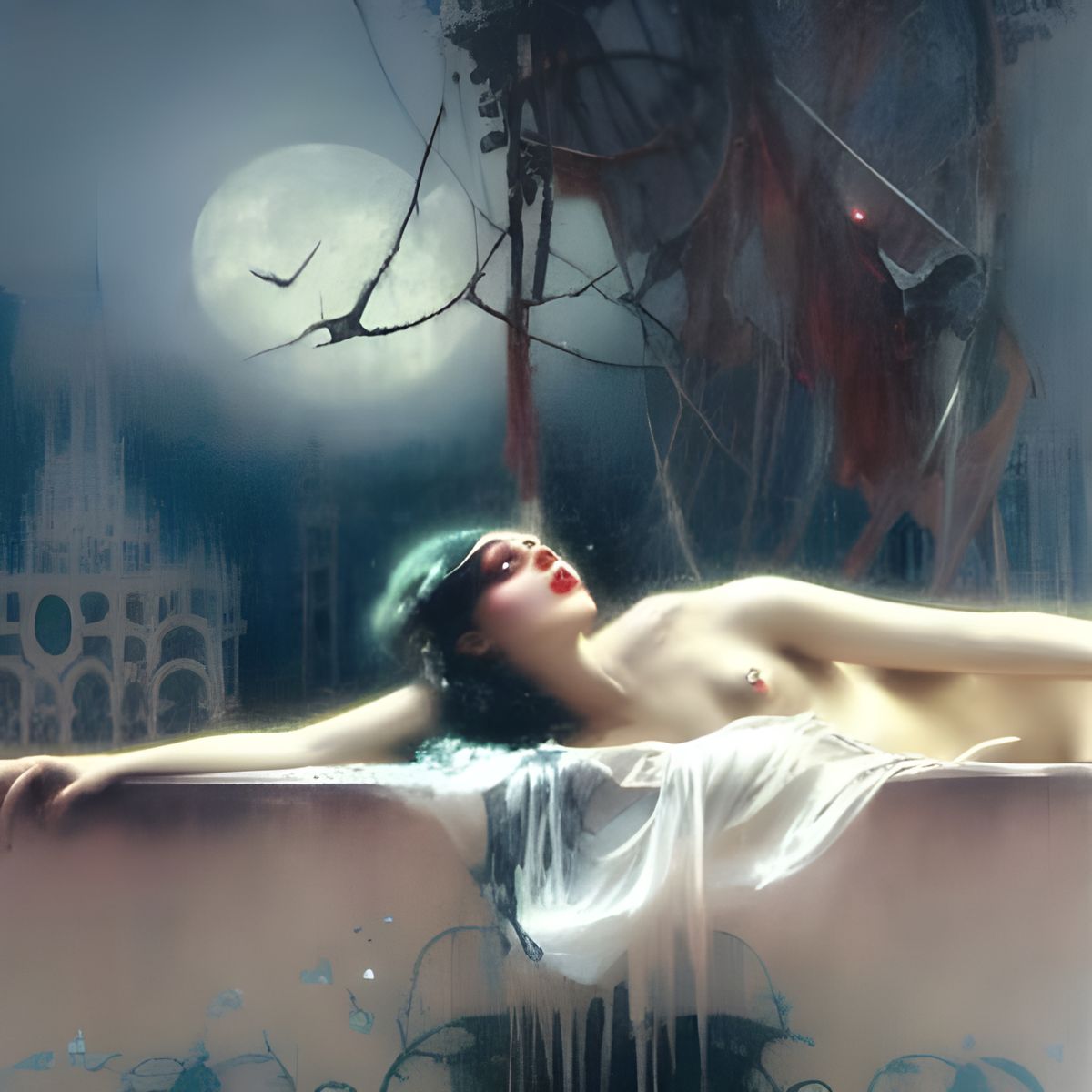 This image shows a serene and ethereal moonscape in a romantic, film noir style. The artwork evokes a mysterious and detailed scene with synthwave elements.