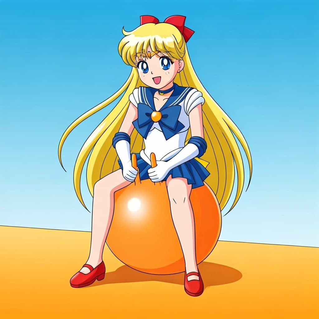 This image shows Sailor Venus enjoying a fun moment bouncing on a large, orange hopper ball. The scene captures a lighthearted and playful side of the character.