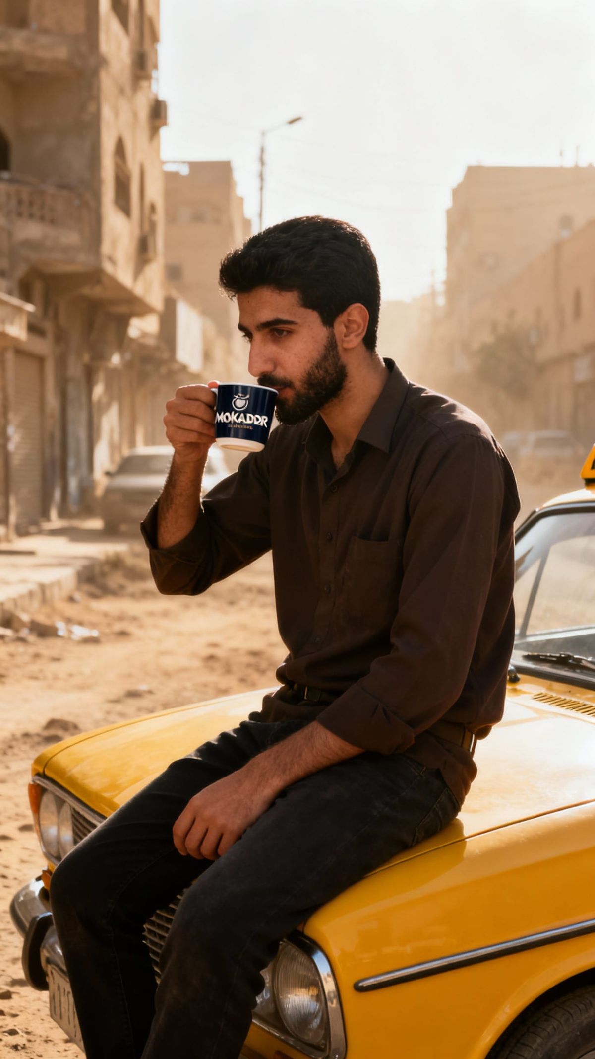 A photorealistic image of a young Iraqi taxi driver relaxing on his yellow cab on a dusty Baghdad street. Early morning sunlight creates a warm, cinematic atmosphere.