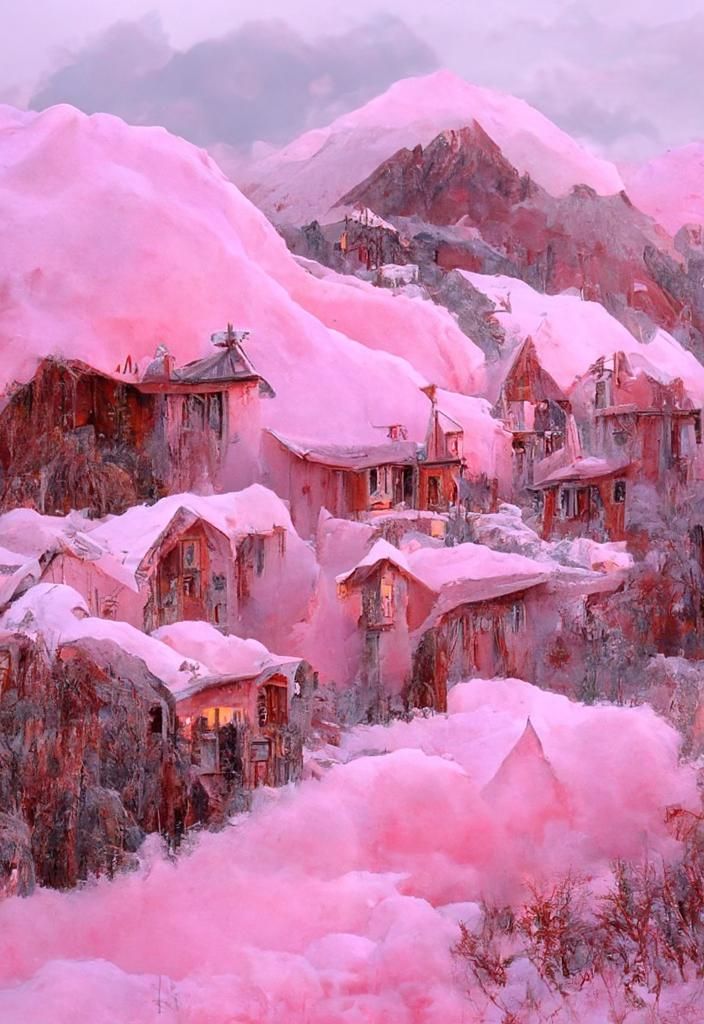 Snowy mountains and pastel pink houses by Lamin Martin (fantasy, 8k detailed digital illustration, beautiful, light colors, intricate)