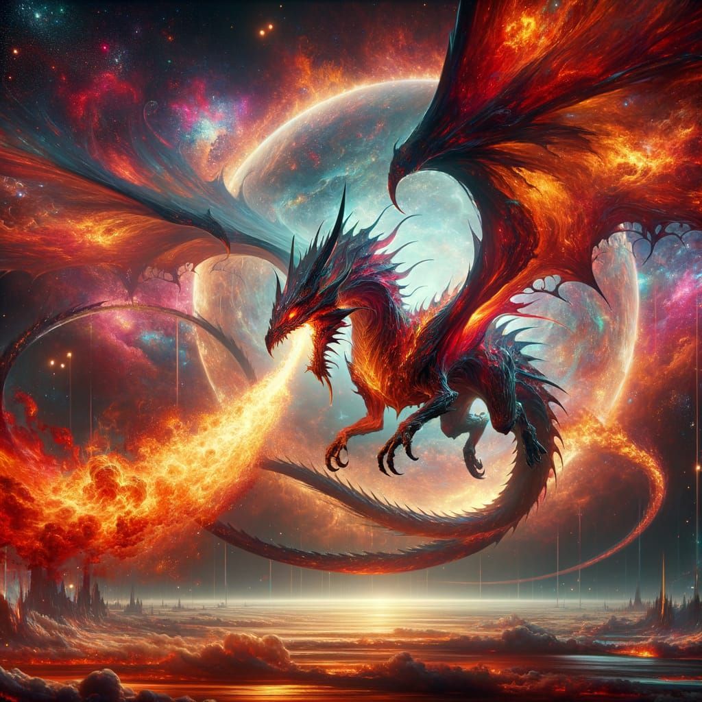 This image shows a menacing fire dragon in flight against the backdrop of space. The dragon breathes fire in a hyperrealistic style, with HD graphics to create a captivating blend of surrealism.