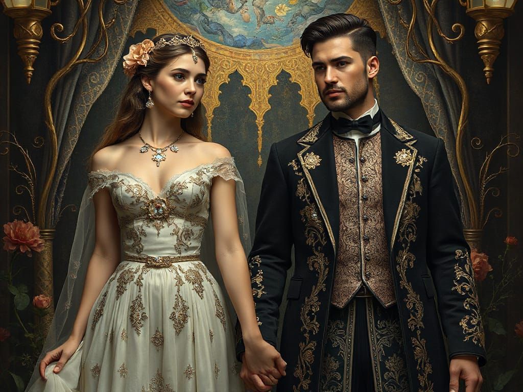 This image shows a man and woman in elaborate clothing holding hands in a fantastical setting. The artwork is reminiscent of Klimt, employing maximalist and hyper-realistic elements with cinematography-inspired details and textures.