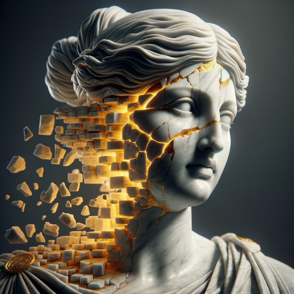 This image shows a weathered white marble statue of a Roman woman on a pedestal. Cracks reveal a second woman emerging from within, alive and glowing in Roman robes. The image is cinematic and realistic.