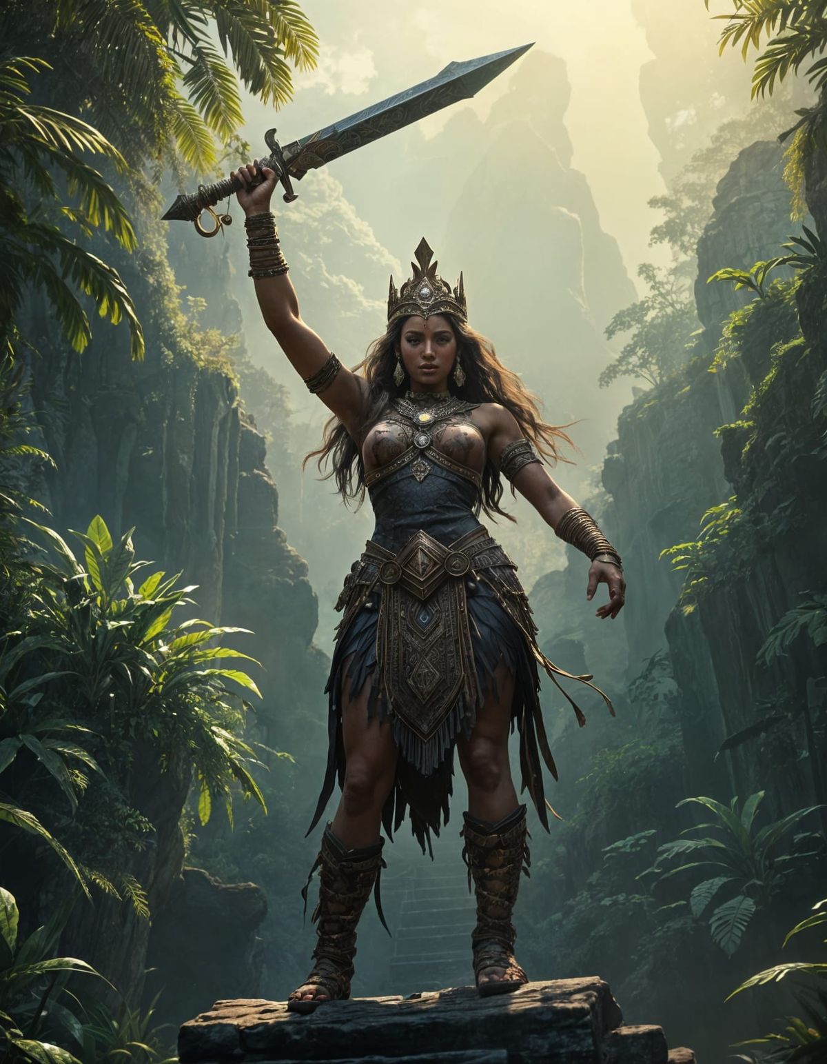 This image depicts a powerful tribal queen standing atop a ziggurat in a lush jungle, exuding fierce determination and reverence. Rendered in a hyperrealistic style, the artwork showcases intricate details, dynamic lighting, and deep colors, evoking a sense of raw power and untamed beauty.