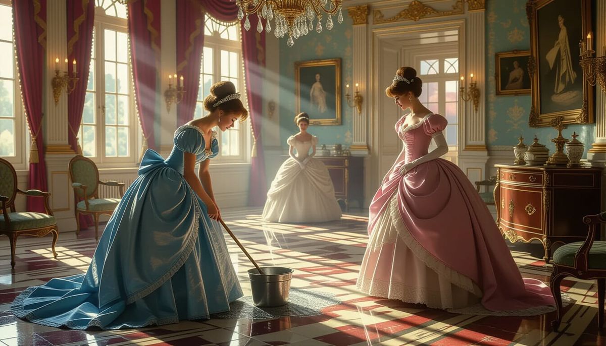 An Impressionist painting capturing Cinderella in rags cleaning grand halls while her elegantly dressed step-sisters look on, rendered with expressive, impasto strokes.
