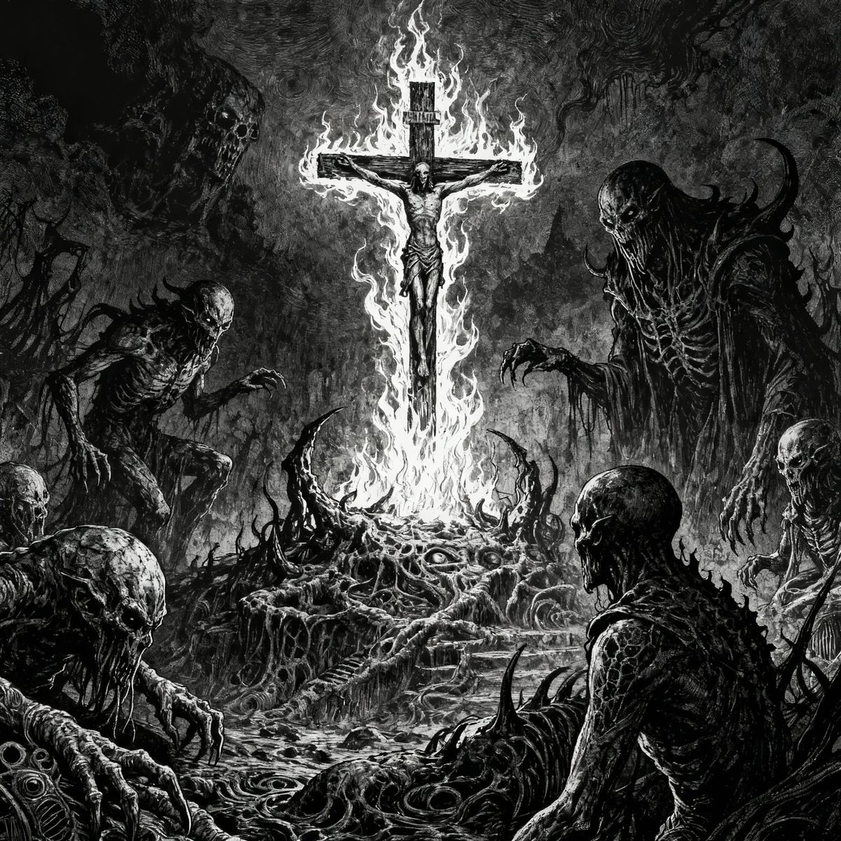 This AI-generated image depicts a dark, ominous scene with hellish creatures and a burning crucifix. It features a black and white palette with intricate, haunting details.