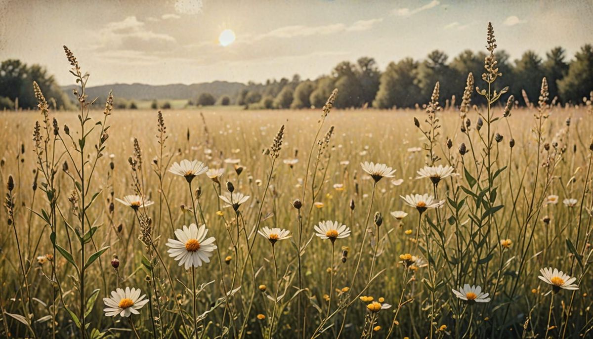 This image shows a sunlit meadow with wildflowers in the style of vintage botanical illustration. It features delicate linework, watercolor effects, and soft, warm tones, reminiscent of antique scientific watercolors.