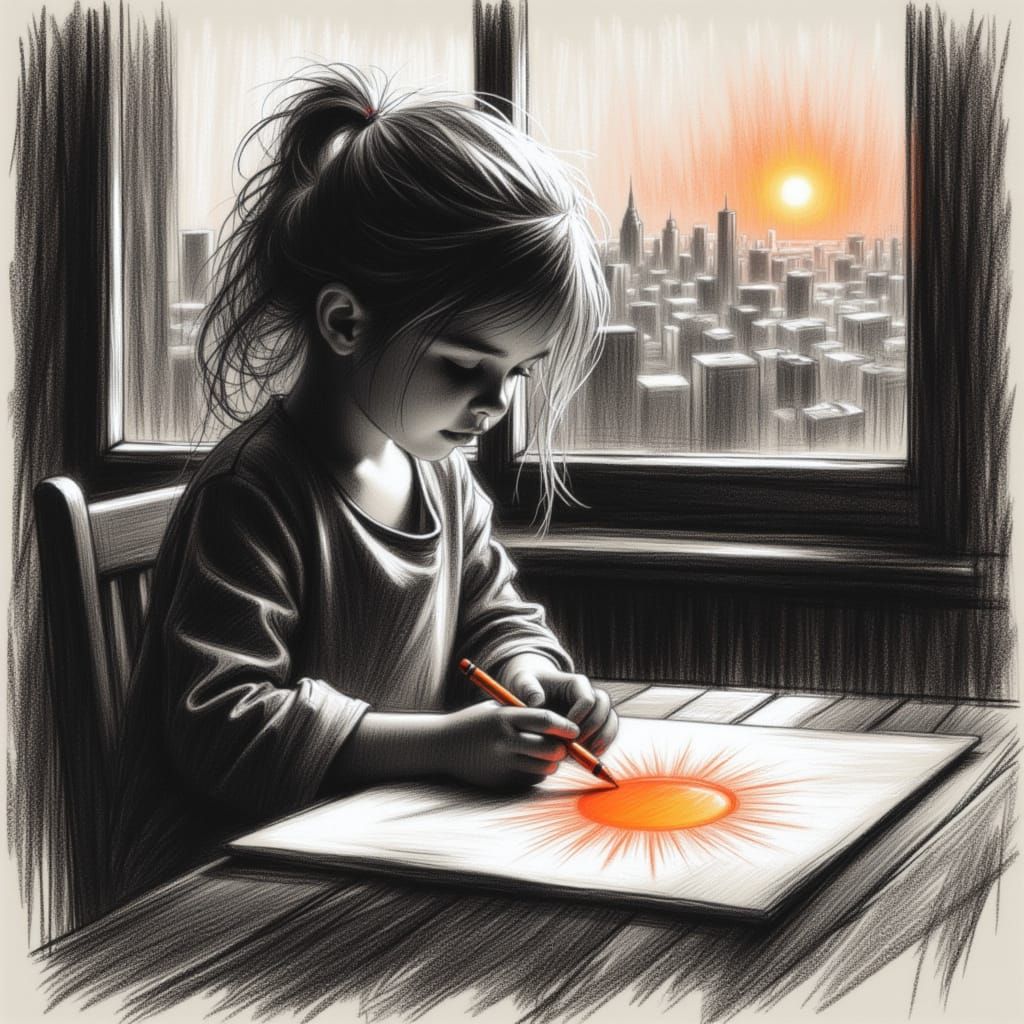 In a world sketched in shadows and lines, she brings the sun to life. The city outside is hushed in grayscale, its skyline a silent testament to complexity. But at the table, a child bends over her page, and with the simplest stroke of orange, she ignites warmth where none had been.