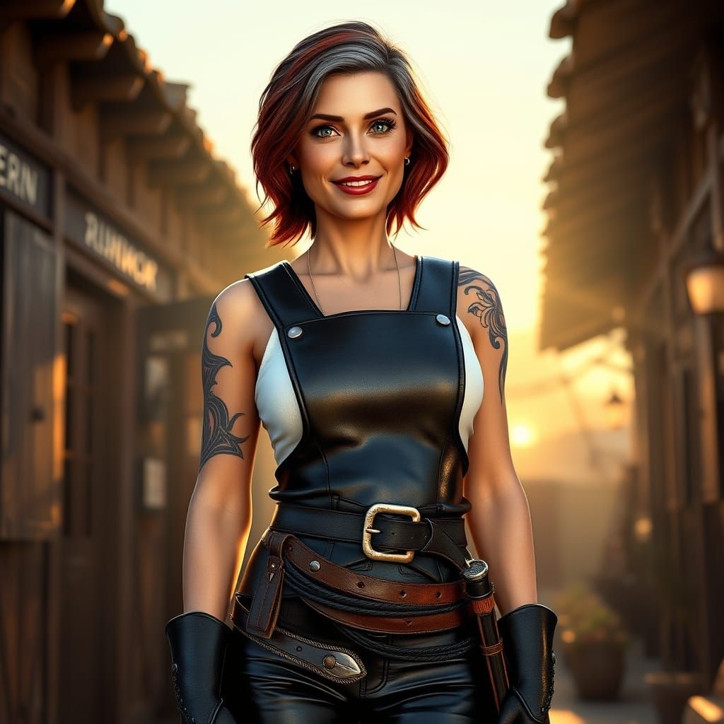 This image depicts a mature woman standing outside a rustic tavern at dawn, surrounded by the soft, golden light of a new day. She wears polished plate armor and carries a sword, with a vibrant tribal tattoo on her shoulder and a subtle sheen on her riding boots.