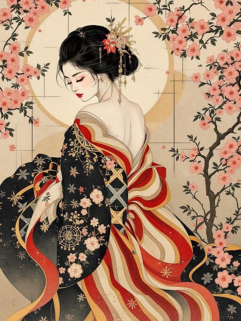 This image showcases a fusion of abstract figure study and vintage pin-up aesthetics. It features geometric patterns, soft retro garden scenery, cherry blossoms, and vibrant lighting, all rendered in the style of ukiyo-e.