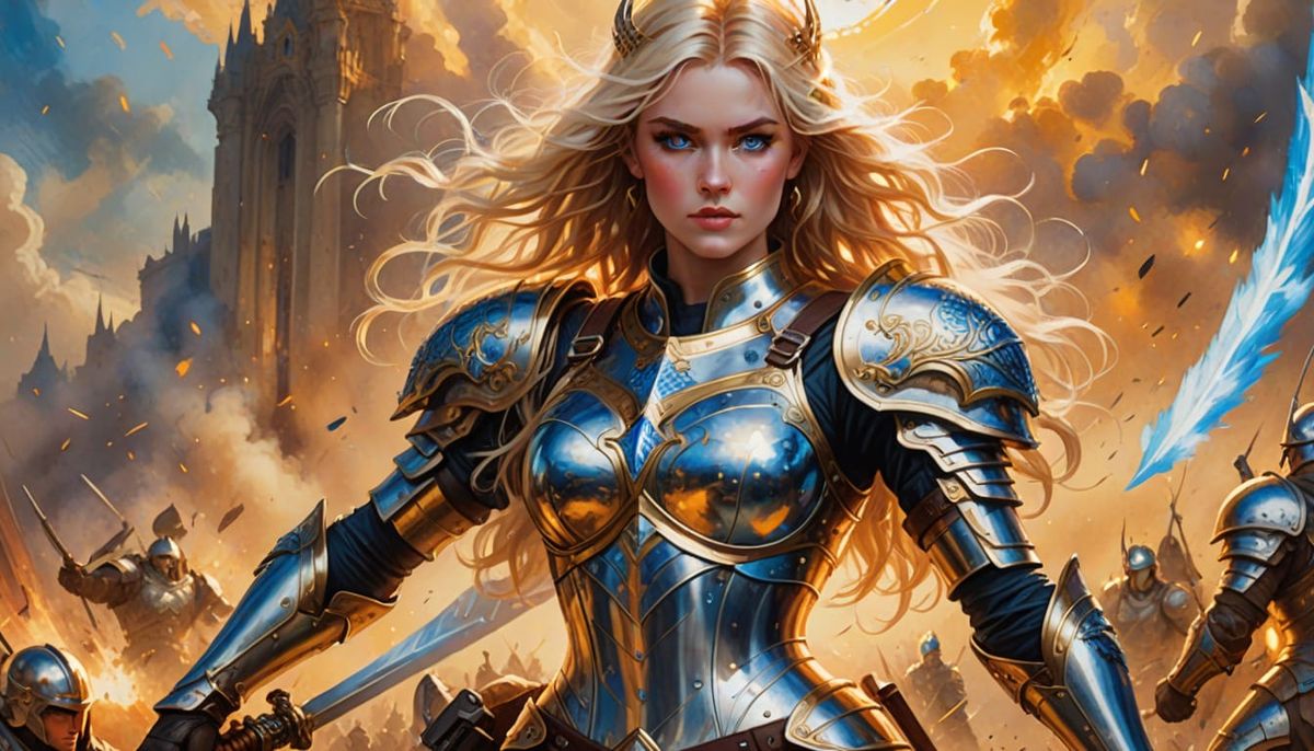 This stunning painting depicts a blonde valkyrie standing heroically amidst a battlefield, bathed in golden light that shines through the smoke. Created in a vibrant splash-art watercolor style reminiscent of Romanticism, this masterpiece showcases refined elegance and incredible detail.