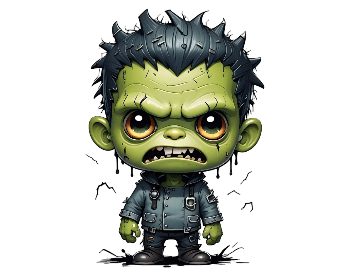 Closeup detailed portrait of adorable chibi frankenstein monster. Bolts in neck. Stitches in head. Torn clothing