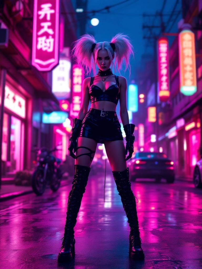 This image shows a fierce cyberpunk woman in a neon-lit city. She is dressed in futuristic fashion, with platinum hair, a crop top and mini skirt. The artwork has a hyperreal, cinematic style.