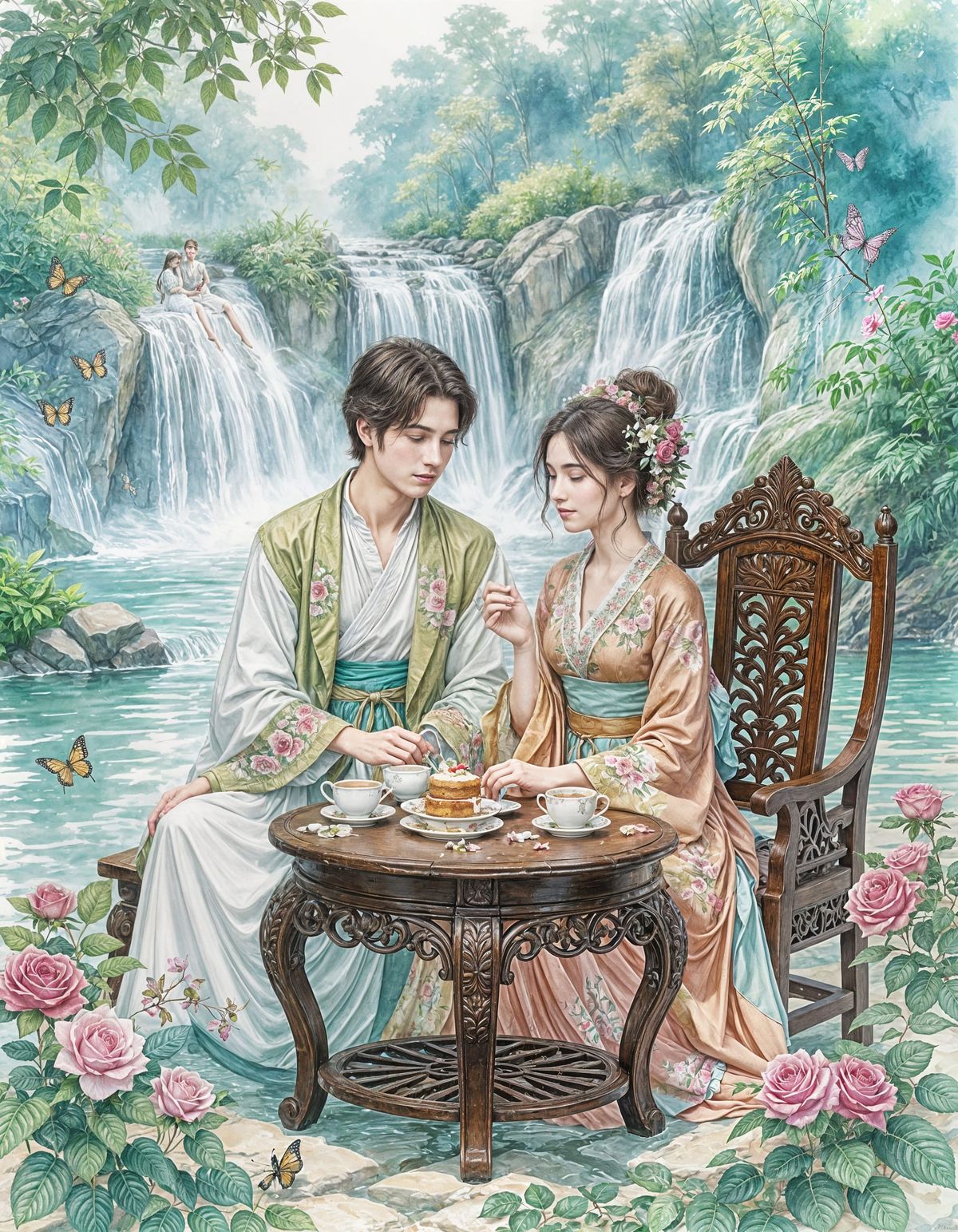 This digital art depicts a tranquil scene of a couple in traditional attire sharing herbal tea beside a stream and waterfall, surrounded by flowers and butterflies.