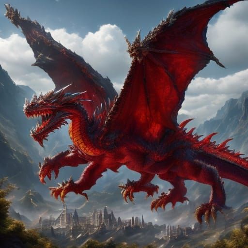 A striking picture of a red dragon in a dramatic landscape with a distant castle. The dragon is depicted with sharp teeth and open mouth, embodying a fearless fighter in a realistic style.