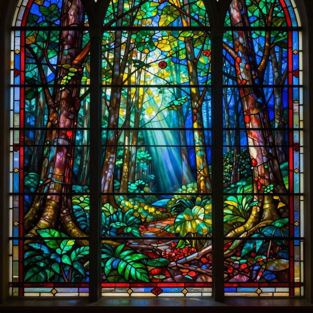 This image showcases a dramatic stained glass window of a forest, featuring vibrant emerald, sapphire, and ruby colors. Sunlight streams through, creating an ethereal, painterly atmosphere with deep contrast and rich textures.