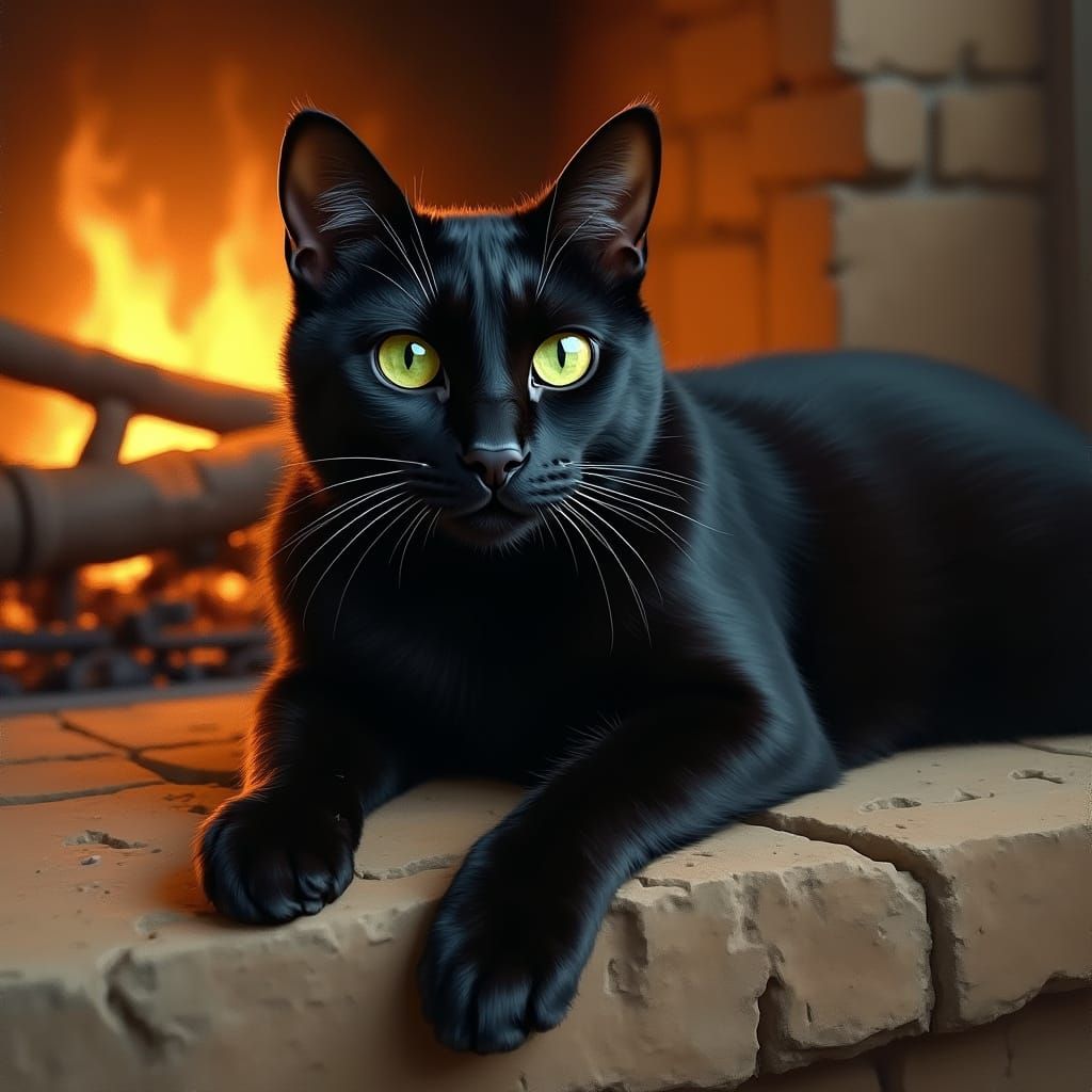 This image shows a beautiful, all black cat with striking green eyes, lounging in front of a crackling fireplace, evoking a sense of warmth and intimacy, in a traditional realistic style with loose brushstrokes and soft textures.