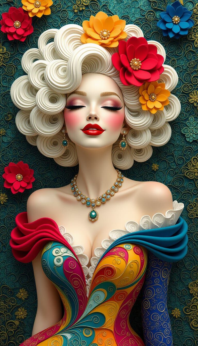 A digital rendering of a curly-haired woman in an elaborate gown. The hyperdetailed image features resin wire art and Escher-esque architecture in a vibrant color palette.