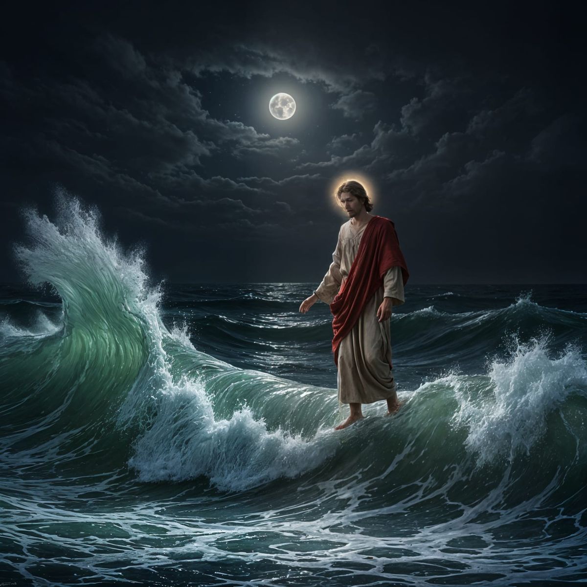 This realistic oil painting depicts Jesus Christ walking calmly atop a violently stormy sea under the dark night sky. The dramatic scene captures divine power over nature.