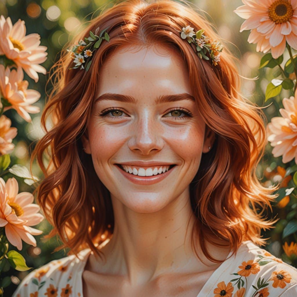 Create stunning portraits of smiling women with copper hair and floral frames with our free AI image generator.