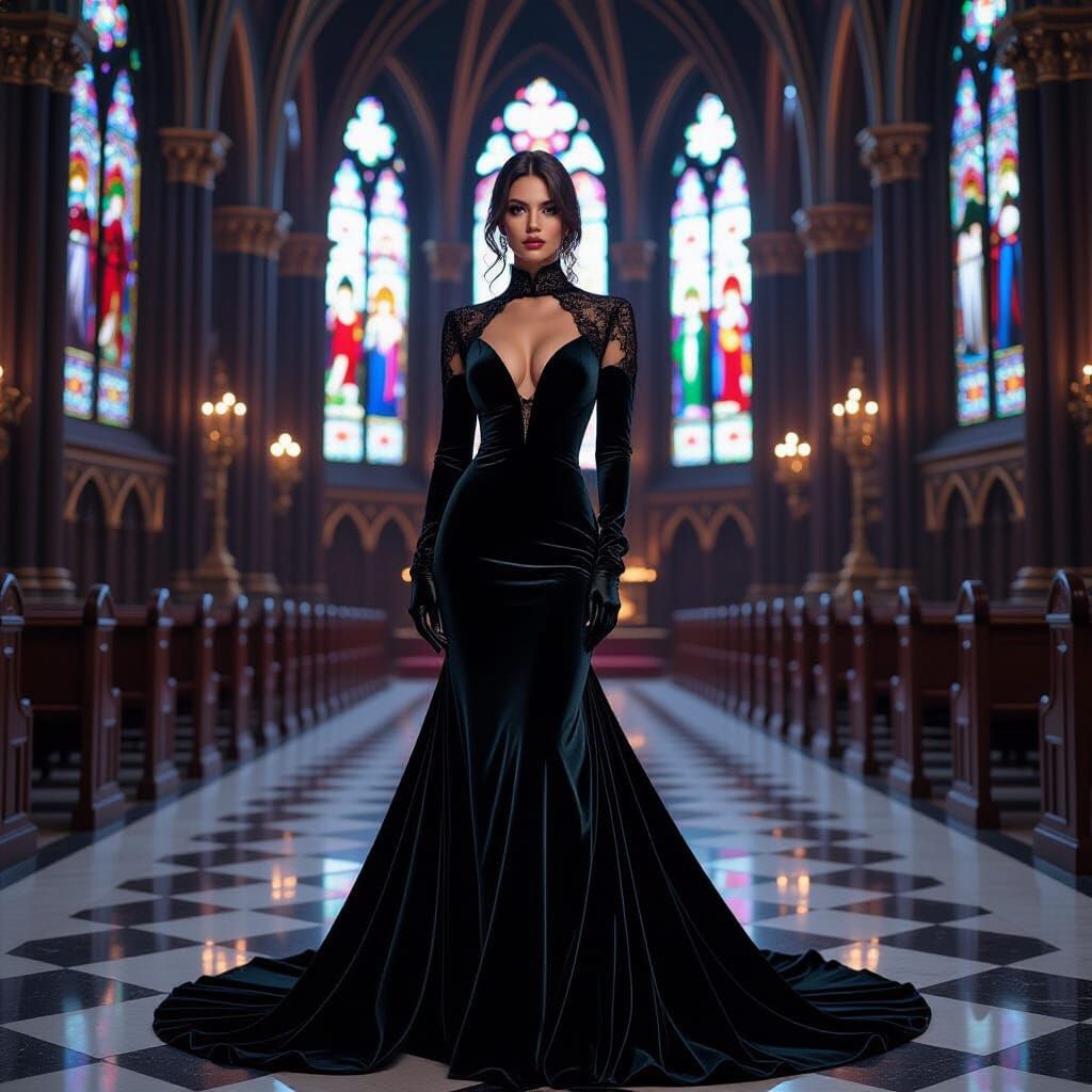 A gothic woman stands in a cathedral bathed in colorful light. She wears a black velvet gown with lace and satin gloves. This image evokes a dark, mystical aesthetic.