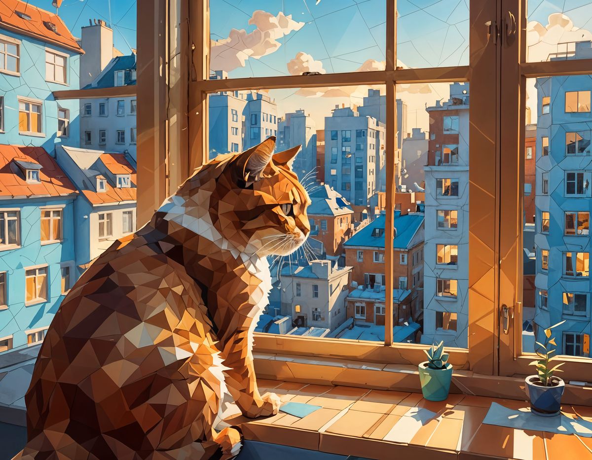 A brown cat gazes out a fifth-story window at tiny people below. The feline seems to contemplate hunting the people as if they were ants from its high vantage point.