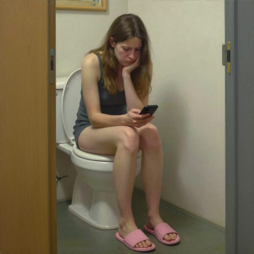 This realistic painting shows an exhausted woman on a toilet, engrossed in her phone. Soft lighting and a muted color palette enhance the feeling of weariness.