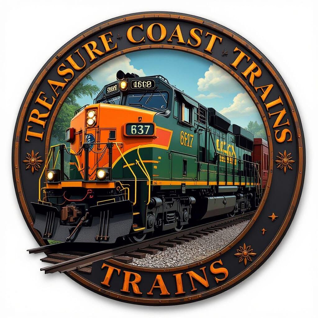 A circular logo featuring an Alco F7 diesel locomotive in orange, black, and green. The name Treasure Coast Trains is integrated with intricate details and dynamic lighting, presented as fantasy concept art.