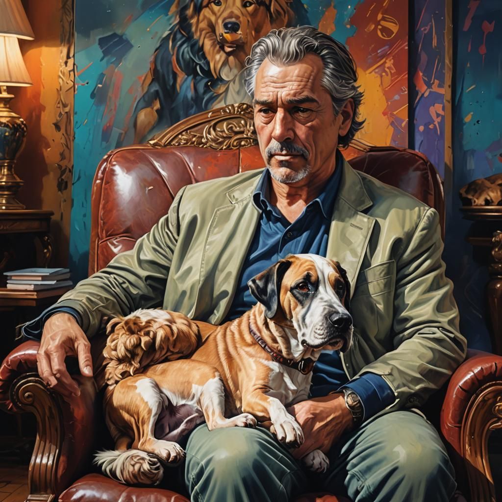 This image shows a middle-aged man relaxing in an armchair with a large dog resting on his lap. The artwork is rendered in a hyperrealistic style with vibrant colors and intricate details.