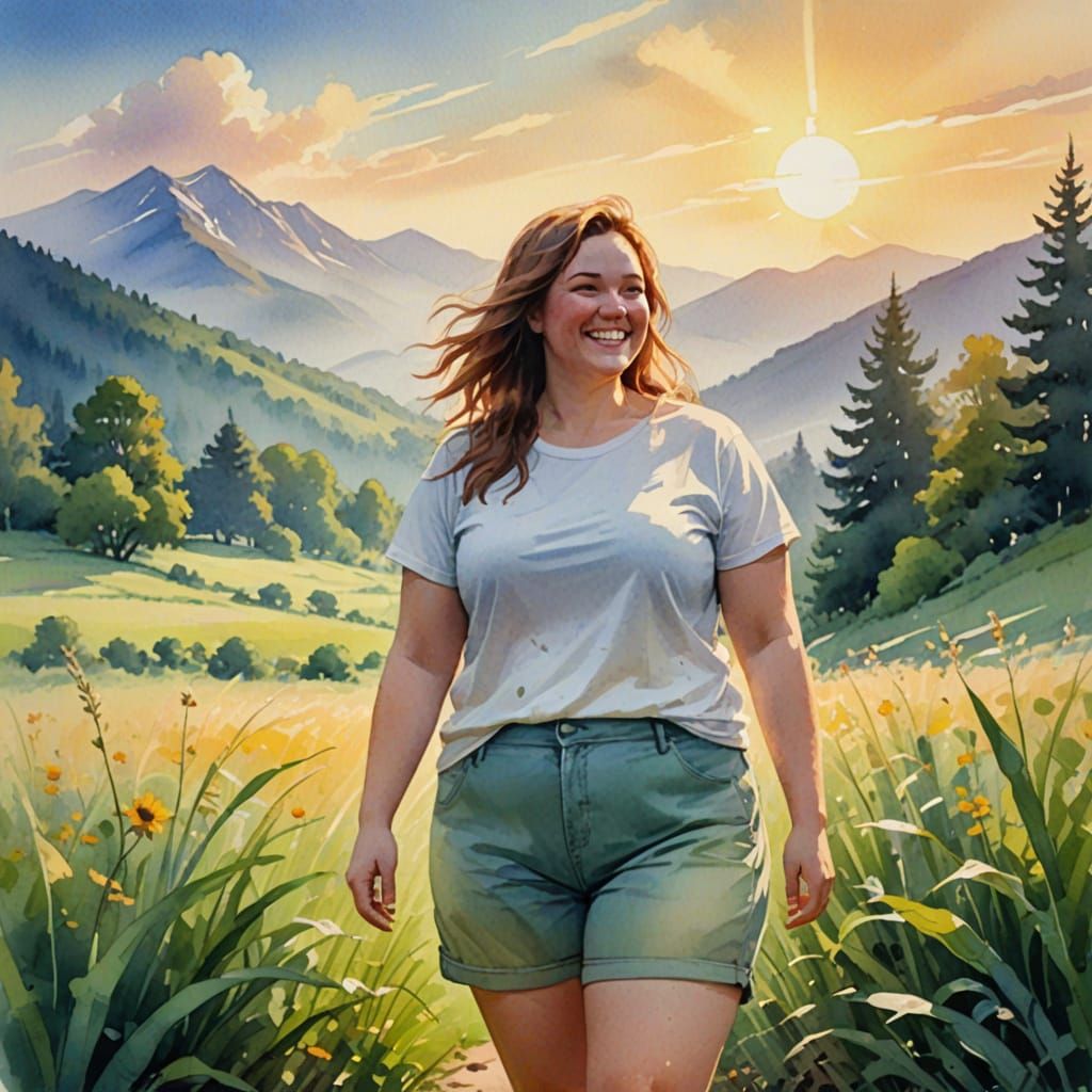 This image shows a smiling woman with a kind face, standing in a serene valley surrounded by majestic mountains and lush vegetation, bathed in the warm, golden light of the setting sun, with a whimsical, impressionist style and vibrant colors.