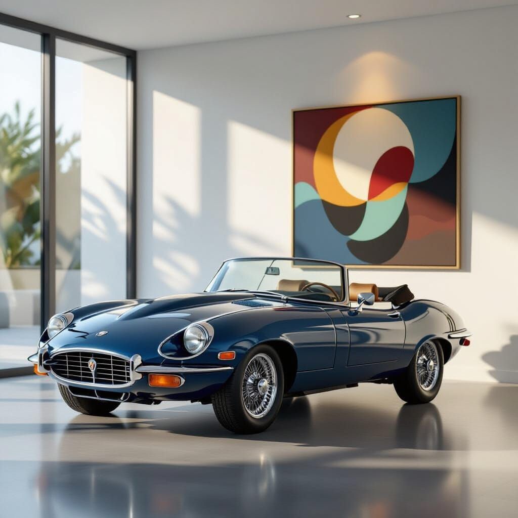 This photorealistic image showcases a dark blue 1974 Jaguar XKE roadster displayed as art in a minimalist modern living room. Soft golden hour light highlights the car and a nearby abstract painting.