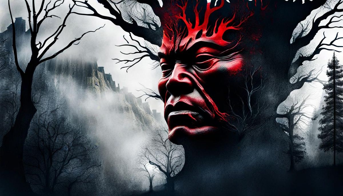 Haunted_forest+AKUMA_GHOST+Tree+FACE, double exposure dripping art, wax and ink, Layered Inside, double exposure, merged Painterly styles by Photoshop, transparency layers bleeding through, face side on. 64 megapixels. 3D depth textured. multiple_source_Volumetric _lighting. HDR. 16K. SAMURAI POETRY ...