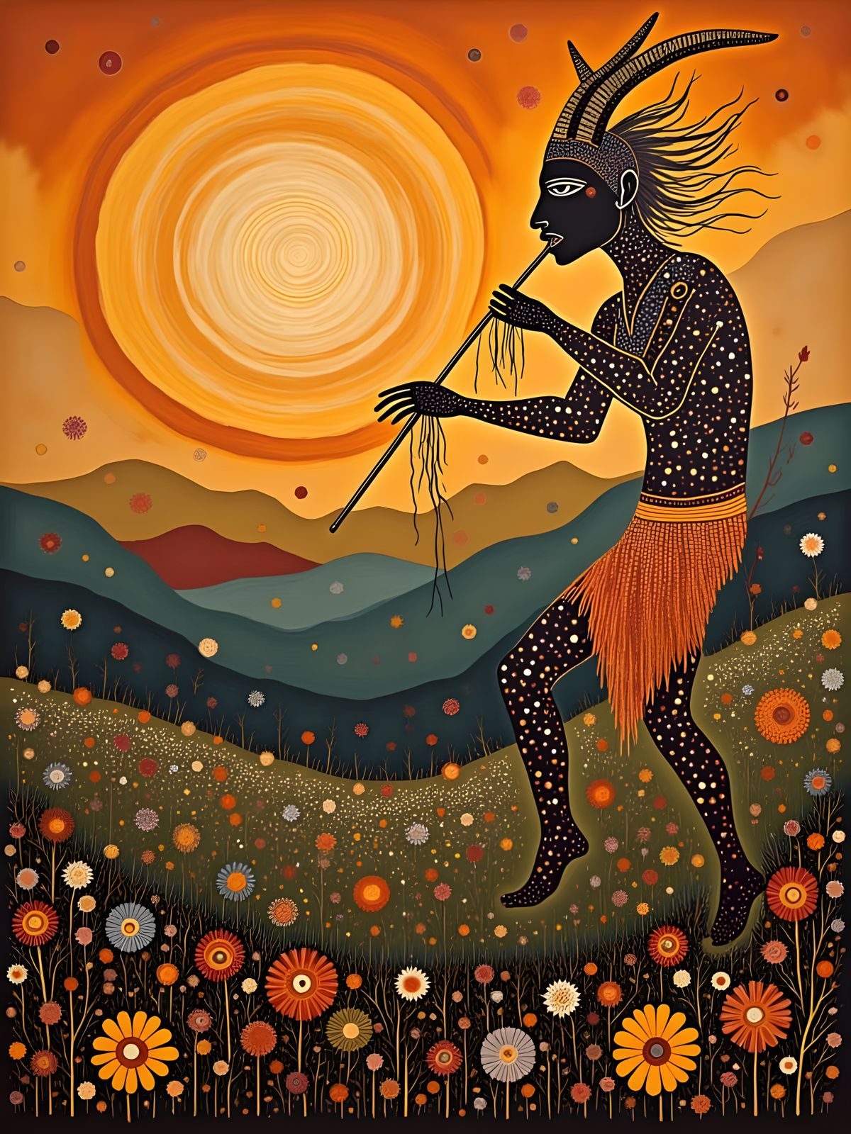 <lora:Pagan Moon:1.0> <lora:Paleo Tribal Essence:1.0> <lora:Mythoglyphic:1.0> Portrait of the Greek deity Pan plays his pan pipes and dances on a flower covered hill as the sun rises like a spiralling orb in the sky, radiant and golden. Heavily textured canvas. In the style of Klimt and Caravaggio. Intense, ...